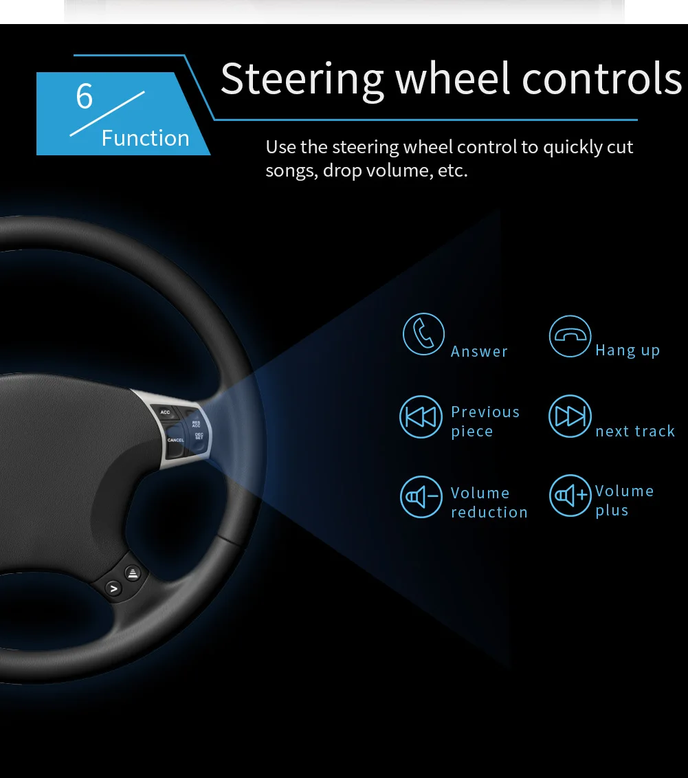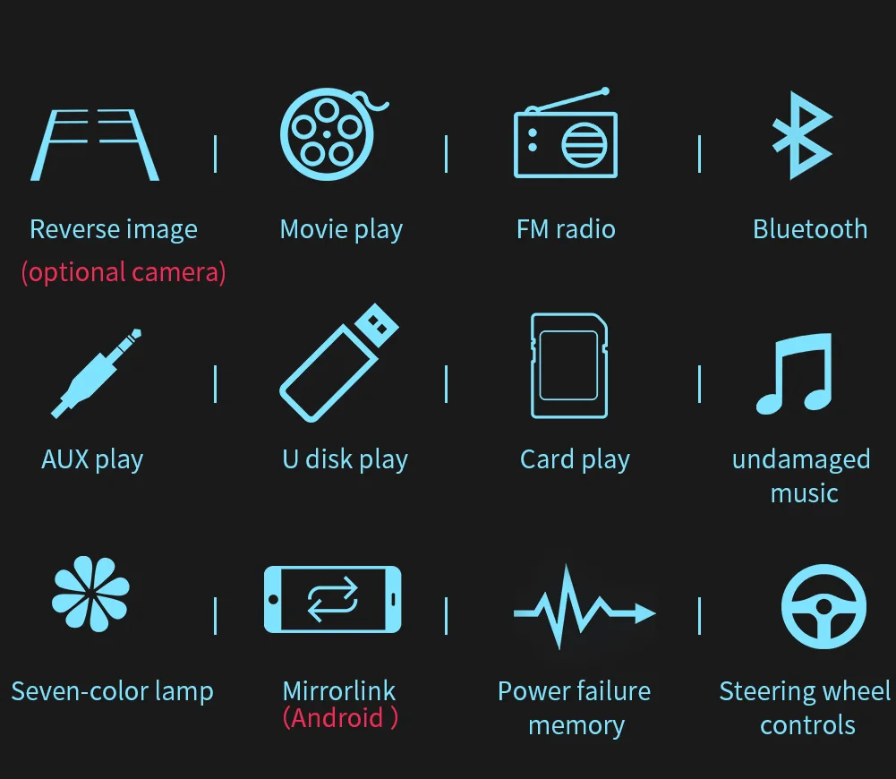 Function: Stereo, HANDSFREE, RGB, Remote Control, Mirror Link, Car Steering Wheel Control